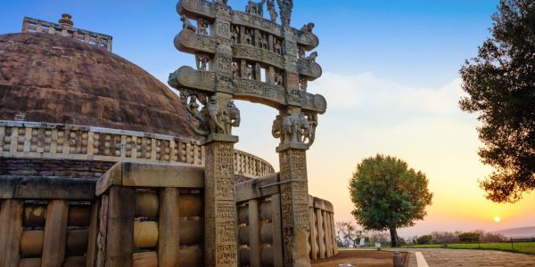 Sanchi Stupa is a Buddhist complex, famous for its Great Stupa, on a hilltop at Sanchi Town in Raisen District of the State of Madhya Pradesh, India. It is located, about 23 kilometers from Raisen town, district headquarter and 46 kilometres (29 mi) north-east of Bhopal, capital of Madhya Pradesh.